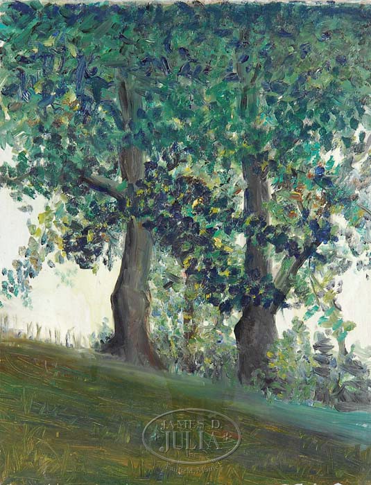 CHARLES F. BOHANNAH (American, 1910-1985) PAIR OF LANDSCAPES. Both unframed and show summer landscapes with trees and grass. One is illegibly signed lower left and the other is unsigned. Both come with Estate artist card indicating that the artist is an African-American and resided in New York City. SIZE: 18″ x 14″ and 14″ x 18″. CONDITION: Uneven varnish layer on one, otherwise very good. 9-94329 (600-800)