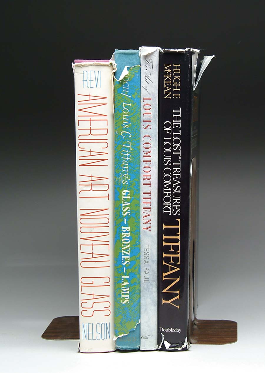 SIX REFERENCE BOOKS. Lot includes “Art Glass Shades” by Roberts, “The Lost Treasures of Louis Comfort Tiffany” by McKean, “The Art of Louis Comfort Tiffany” by Paul, “Louis C. Tiffany: Glass, Bronzes, Lamps” by Koch, “American Art Nouveau Glass” by Revi and “The Lamps of Tiffany” by Neustadt. CONDITION: Books have been used but overall good. Estate of Jon Heiden & Donald Mooers 5-60788-4 (300-500)