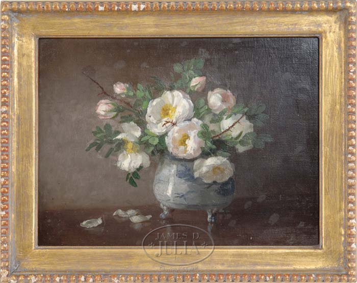 ANNA ELIZA HARDY (American, 1839-1934) “WHITE ROSES”. Unsigned oil on board shows a still life of white roses in a blue and white decorated vase. Three petals have fallen onto the tabletop surface. Housed in a bead decorated modern gilt frame. A typed card on back indicates that this was “A gift to Ada Stetson Peirce on her 7th birthday at Bangor. She being in Rome, or thereabouts, we, Waldo, Chamberlain, and myself honored the day at home with loving thoughts and gifts.” Signed “Laura Hayford Grandmother”. SIZE: 9” x 12”. CONDITION: Very good. 9-70766 (4,000-6,000)