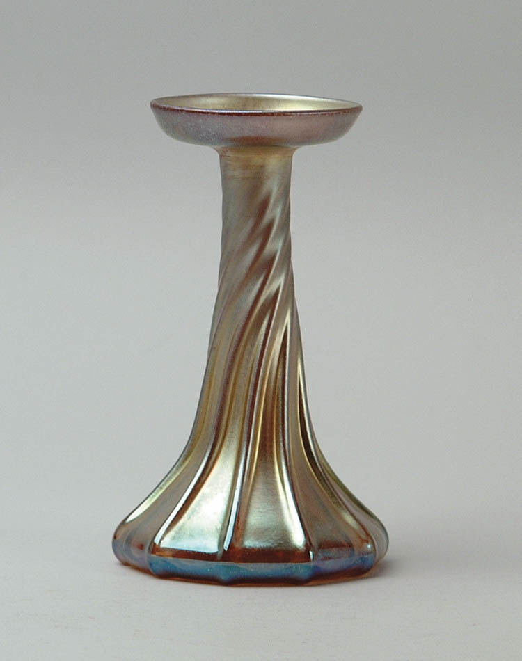 TIFFANY CANDLELAMP LAMP BASE. Iridescent gold finish with swirled ribbing, button pontil. Signed on base “L.C.T.” SIZE: 7 1/4″ tall. CONDITION: Very good to excellent. 5-67308 (700-900)
