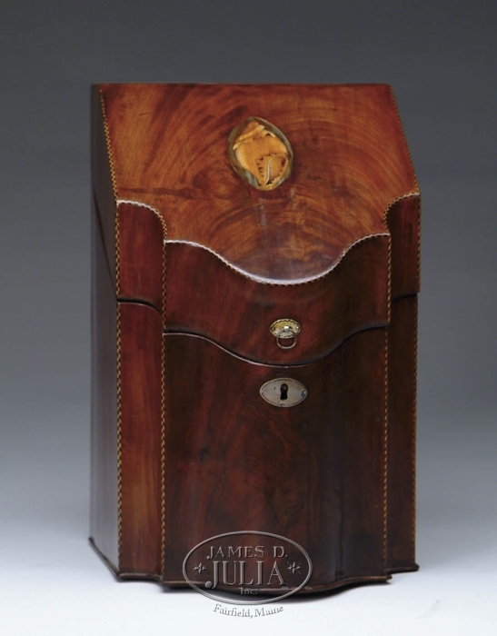 FINE INLAID MAHOGANY KNIFE BOX. The shaped front box has original ring pull and chased escutcheon. The angle hinged top has oval shell inlay, the interior of top with star inlay. The top edges and front edges have a dark and light arrow corner inlay. The fitted interior is not present. SIZE: 14” h x 9” w x 10-1/2” d. CONDITION: Generally very good. 9-28005 (400-800)