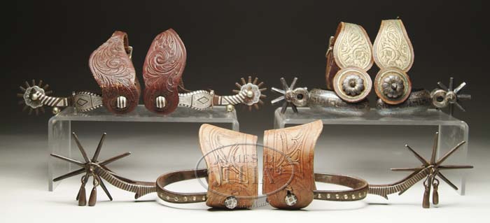 FIVE PAIRS OF MISC. SPURS. (1) Large Spanish star wheels with silver bar inlays, 4-1/2″, 8 point rowels with dbl jinglebobs & dbl heel chains and lightly decorated straps. Dark brown patina, good. (2) Late Garcia-style with 2″ shanks, ball chap guards, 2″, 14 point rowels with heavy yokes and chain slots with silver overlay and carved straps. CONDITION: Blue mostly turned to brown, good. (3) Heavy silver overlay Mexican Style with 1-1/2″ figure eight shanks with 2-3/4″, 8 point rowels, very nicely engraved silver overlay all the way around with large flower blossom swinging buttons and very nicely carved straps. A tag on the inside states “Lincoln County New Mexico” somewhat tarnished with honest wear. CONDITION: Very good. (4) Very heavy Mexican Style with 1-1/4″ serpentine shanks with heavy, 2-1/4″, 8 point rowels. They have silver overlay with triple Greek key design and large flower blossom swinging buttons. The straps are beautifully embroidered with gold bullion thread. CONDITION: Very Good plus. (5) Heavy Mexican Style with 1-3/4″ serpentine shanks, 3-1/4″, 8 point rowels with silver bar overlay on one side with leaf and flower design on other side. They have swinging buttons with the outside having silver bar overlay, nicely carved straps. CONDITION: Good. 4-57720 JR519 (1,000-2,000)