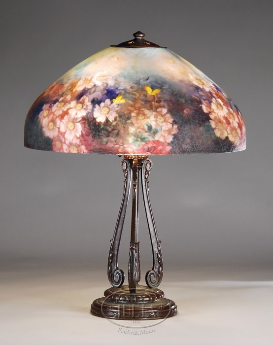 HANDEL 6688 FLORAL & BUTTERFLY TABLE LAMP. Very pretty reverse painted shade depicts a pink floral pattern overall with butterflies against a multicolored green and blue background. Shade is also lobed, which is considered a rarity. Signed on the rim “Handel 6688”. Shade is supported by a three column base of Art Nouveau styling with brown finish having three sockets and acorn pulls. SIZE: shade is 18″ dia. Overall 23″ t. CONDITION: Shade has two tiny areas of repair to the rim and minor loss to finish on base. 5-67686 (12,000-15,000)
