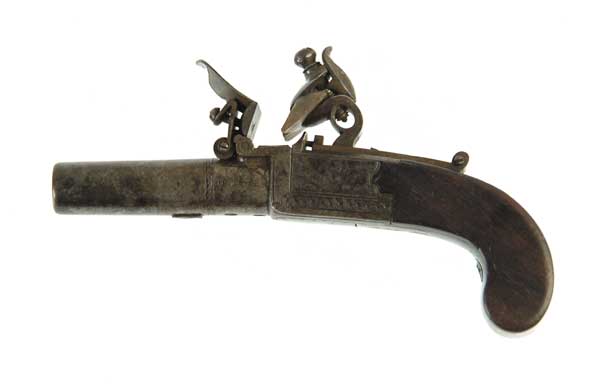 SMALL DURS EGG FLINTLOCK PISTOL. Cal .44. 1-3/4” round bbl. Marked “D-EGG” on the left side of the chamber, “LONDON” on the right. NSN. CONDITION: Gray brown patina overall. Minor dents and scratches on the stock. Action is fine. 4-49304 FS189 (300-600)