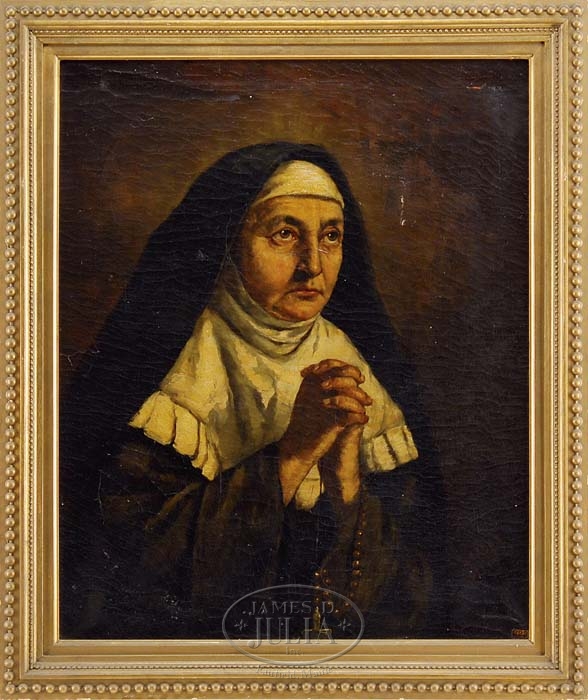 L. O. KURZ (German, 19th Century) IN PRAYER. Oil on canvas half portrait of a nun with hands clasped praying. She wears a rosary and cross. Signed lower right “L.O. Kurz Paris”. Housed in what appears to be its original wide frame liner. SIZE: 28-1/2″ x 23-1/2″. CONDITION: Extensive craquelure, appears to have a repaired tear in background but does not show under blacklight. 9-91014 (200-400)