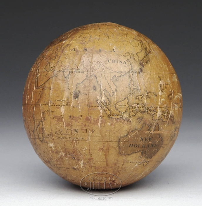 SMALL TABLE TOP TERRESTRIAL GLOBE BY D. C. & A. MURDOCK WEST BOYLSTON, MASS. 5” dia globe has a paper matte covering over a wood center. Round name print is to the left of North America. 19th Century. Circa 1835-1840. David Clark Murdock became partners with his son Albert in 1835. CONDITION: There are some stains, most notably in the Atlantic Ocean. Some rub marks to high points, generally intact. The globe has holes in each end from which is was probably mounted on a stand. 9-29189 (500-1000)