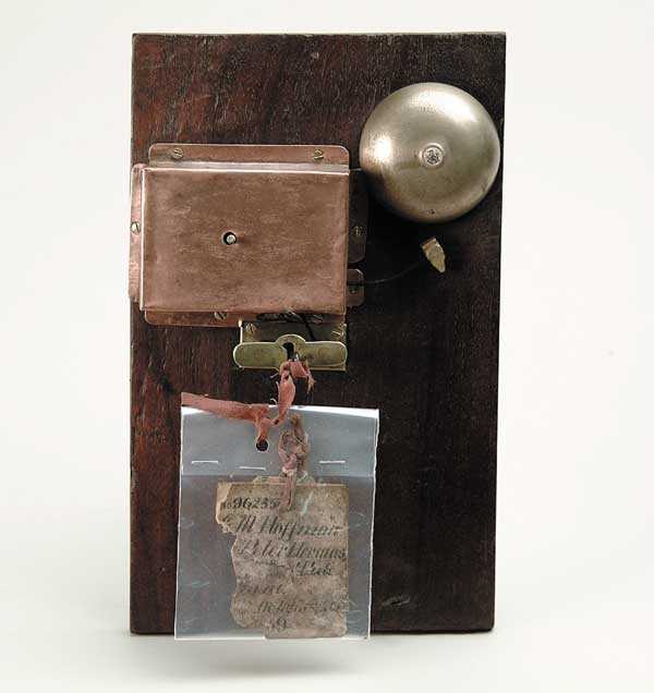 PATENT MODEL: HOFFMAN & PETER HERMAS, JR. TIDE ALARM Partial original patent tag no. 96235, patented Oct. 26 1869. Bell and alarm mounted on wooden board. SIZE: 12″ h x 7″ w x 2” d. CONDITION: Good. 1-29779 (300-500) Auction: Advertising, Toy & Doll - Spring 2003 Please Note: All prices include the hammer price plus the buyer’s premium, which is paid by the buyer as part of the purchase price. The prices noted here after the auction are considered unofficial and do not become official until after the 46th day. |