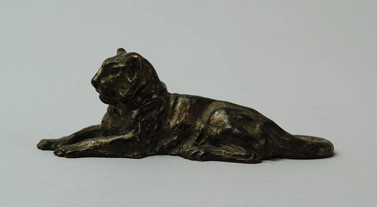BRONZE TIFFANY PAPERWEIGHT. Figural bronze of a reclining lion. Signed on base “TIFFANY STUDIOS NEW YORK”. SIZE: 5″ long. CONDITION: Very good to excellent. 5-67597 (600-900)