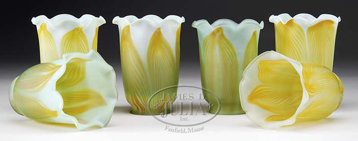 SIX EARLY TIFFANY ART GLASS SHADES. Shades begin with a butterscotch pulled feather design on a white background with nice ruffled rims. All shades are marked with an early number and are not a matched set. SIZE: 5-1/4″ t. CONDITION: Very good to excellent with some shades having chips to the fitter rim. 5-67583 (4,000-6,000)