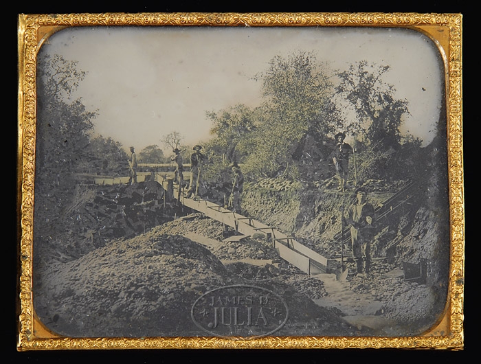 RARE GOLD MINING HALF PLATE AMBROTYPE. The ambrotype depicts six miners and a long sluice crossing a ravine in two directions. Each miner having an implement in hand and either standing on the sluice or nearby. Housed in what appears to be its original pressed leather decorated case which is “as is”. SIZE: 4-1/4″ x 5-1/2″. CONDITION: The black painted back surface has extensive chipping, flaking and losses. The image is clear. 9-92250 (5,000-10,000)