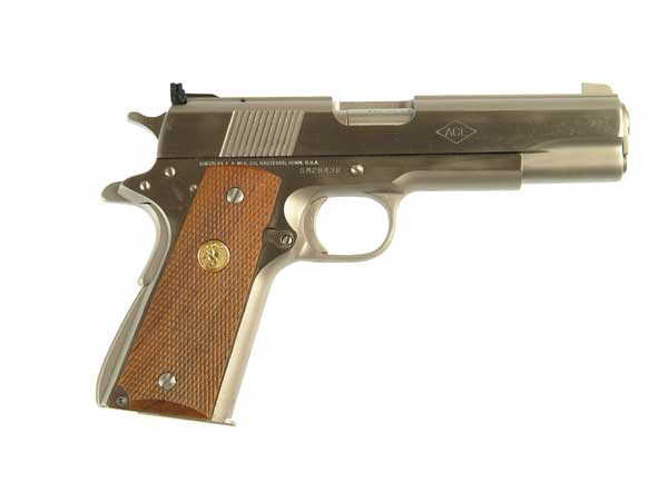 *SCARCE COLT SERVICE MODEL ACE PISTOL. Cal. 22LR. Made in the 1970’s, Government Model size pistol with scarce Electroless Nickel finish, “ACE” markings on the sides of the slide, adjustable sights and checkered, gold medallion grips. Accompanied by its original Custom Shop Styrofoam and wood-grain, one-piece cardboard box, owner’s manual and papers. SN SM28438 CONDITION: Appears to be new in the box, no evidence of having been fired, retains all its original finish. 4-49021 JR461 (1,000-1,500)