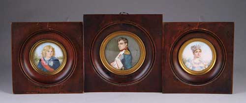 THREE ROUND MINIATURE ON IVORY PORTRAITS OF NAPOLEON’S FAMILY. All in similar frames. 1) Shows a side view half portrait of Napoleon signed “Derval”. 2) Josephine with crown and blue dress shoulder portrait signed “Raynal”. 3) “Roi De Norne” young boy with curly blonde hair and uniform. Signed “Derval”. SIZE: Approximately 2” dia. CONDITION: Very good. 9-98479 (1,500-2,000)