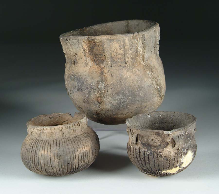 THREE MISSISSIPPIAN TYPE POTS. All three are Mississippian period, Circa 1200-1500AD style. 1) Small rocker-dentate strap handled pot with four strap handles and four human face adornos. SIZE: 4” dia x 3-1/4” h. CONDITION: Shows repair and damage. Fair. 2) Neeleys Ferry small bottle with punctate rim and appliqued nodes, incised body. SIZE: 4-1/2” w x 3-1/4” h. CONDITION: Shows some rim damage, fair to good. 3) Mississippian pot with tally marked appliques on neck. SIZE: 6” dia x 5-3/4” h. CONDITION: Shows body damage and repair. Fair. 9-25984-59 The Tennessee Collection of Prehistoric Indian Artifacts from the Allen Graves Estate. SPECIAL NOTE: We do not regularly sell Prehistoric Indian stone artifacts and therefore have very little experience and no expertise in this area. All of the following lots have come from the Collection of the Late Allen Graves of Tennessee. The collection was inherited some years back by his daughter, who now lives in Maine. This collection was consigned to us directly from her. We employed someone to generally identify styles and types, but as stated above, due to our lack of expertise in this field, we can not guarantee the age or origin of the following pieces. We are relying on you, the buyer, to determine to your satisfaction the origin and age of each item in the collection. (300-500)