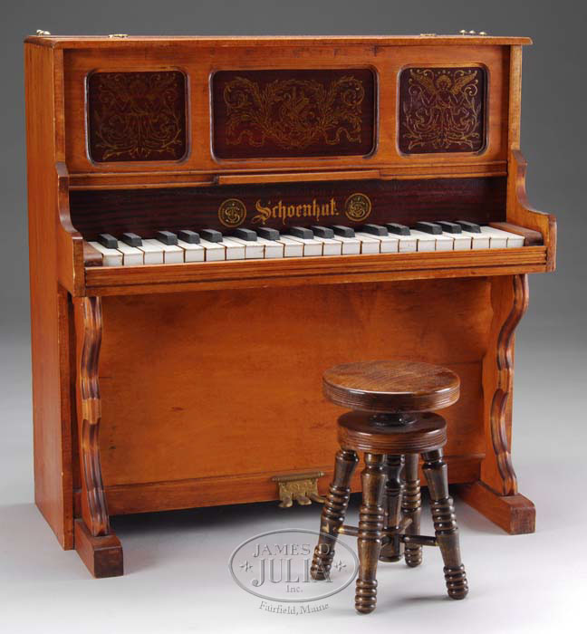 SCHOENHUT UPRIGHT PIANO WITH STOOL. Elaborate upright piano in mahogany finish. Three inset panels of darker stain decorated with cherubs, musical instruments, and vine patterns. Marked “Schoenhut” above 22 white wooden keys and 15 black wooden keys (some not working). Decorative “foot pedals” below. Comes with piano stool of more recent vintage. SIZE: 23″ l x 24″ t x 12″ d. CONDITION: Flip top lid fitted with 6 upholstery tacks. Possibly partially refinished, overall very good. 1-7520, 1-7523 (300-500) Auction: Advertising, Toy & Doll - Spring 2007 Please Note: All prices include the hammer price plus the buyer’s premium, which is paid by the buyer as part of the purchase price. The prices noted here after the auction are considered unofficial and do not become official until after the 46th day. |