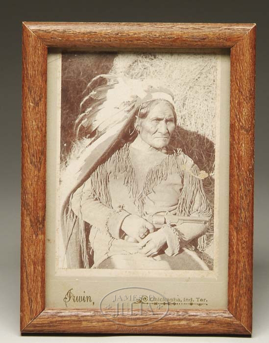 CABINET CARD OF GERONIMO. This extremely popular image of Geronimo decked out in a headdress, fringed buckskins & brandishing a Dance revolver is laid down on a 5-1/2” x 7” board stamped in the lower margin “IRWIN, CHICKASHA, IND. TER.” This was a professional studio photograph by Irwin of the famed Apache Indian chief, one of the most illusive of all. He fought against the whites, was captured by General Cook, eventually escaped & finally surrendered to General Miles. Size of image alone is approximately 3-7/8” x 5-3/8”. CONDITION: Some light foxing. Small piece of image scratched off by his shoulder & a small pinhole at top center of margin. 4-57674 (3,000-5,000)