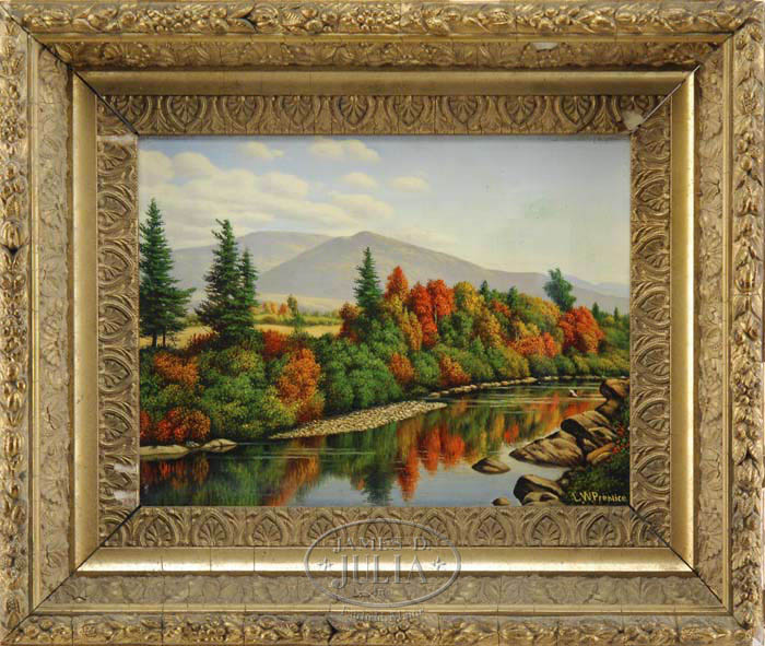 LEVI WELLS PRENTICE (American, 1851-1935) AUTUMN IN THE ADIRONDACKS. Fine oil on canvas scene shows a small river lined with colorful trees and bushes. A rocky bank below mountains under a blue and white cloud sky. Signed lower right “L W Prentice”. Housed in a fine gesso decorated gilt period frame. SIZE: 9” x 12”. CONDITION: Very good, spot in sky repaired. 9-73773 (5,000-7,000)
