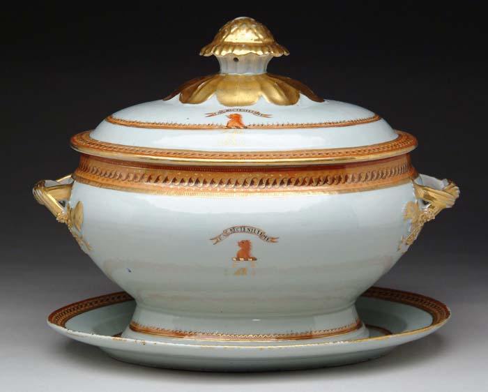 CHINESE EXPORT THREE PIECE SOUP TUREEN. 18th/19th century. The pedestal strap handle oval tureen has matching underliner and cover. All decorated with a salmon, gilt and iron red border and inner border. An iron red lion head with banner above “fac.recte.nil.tine”. The cover having a large mushroom type finial and leaves, monogrammed with a gold “ h”. PROVENANCE: Woolworth Collection. SIZE: Underliner is 13-1/2” x 10-1/2”; Tureen with cover is 10-1/2” h x 14-1/2”l x 9”w. CONDITION: Some gold rub to edges. Very good. 9-72600 (3,000-5,000)