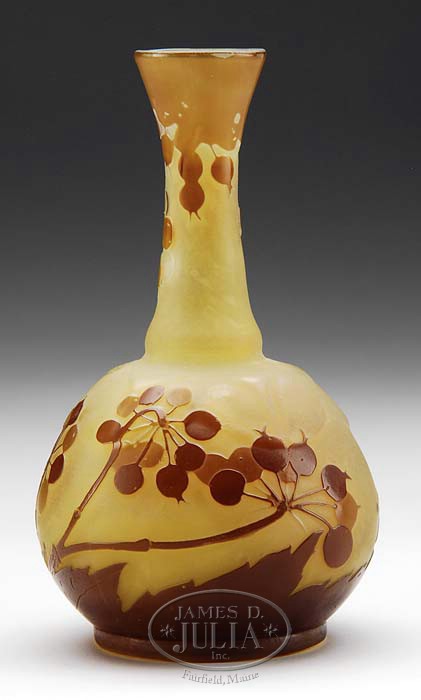 GALLE CAMEO VASE. Unusual Galle vase has brown and tan cameo berries, stems, and leaves against a frosted light amber background. The shoulder of the vase is decorated with a raised pressed organic design. The vase is signed on the side in cameo with a star Galle signature. SIZE: 5-3/4″ h. CONDITION: Very good to excellent, with a tiny acid burn to the lip. 5-67576 (800-1,200)