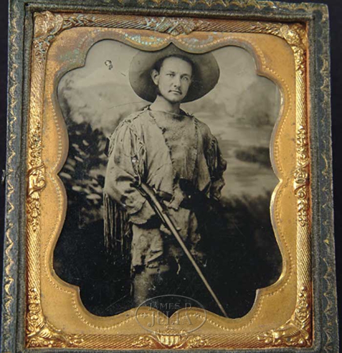 TWO SMALL TINTYPE IMAGES OF WESTERN FIGURES. The first depicting two young cowboys each wearing chaps and brandishing Colt revolvers. SIZE: 3-1/2”h x 2-3/4”w (in gold colored foil frame). The other tintype of a solitary figure in a fringed buckskin shirt with wide brimmed hat, holding a percussion musket. SIZE: 3-3/4”high x 3-1/4”wide (with foil mat and composition frame). CONDITION: Single figure with a couple of pinpoint dents on the image and a couple of minor surface scratches; image rather strong. Cowboys with some imperfections including some image lost within the chest and the background of the larger of the two cowboys; image darker. 4-57681 (500-1,000)