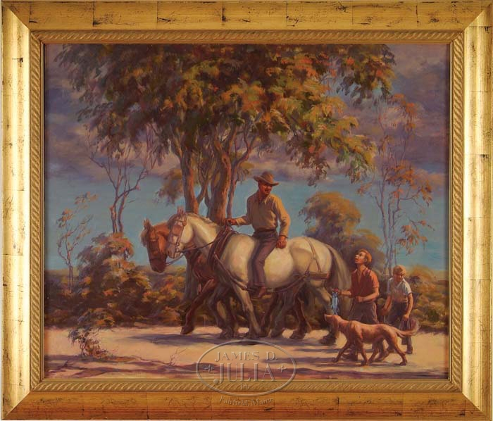 ALPHONSE PALUMBO (American, 1890-1947) BACK FROM FISHING. Large oil on canvas outdoor scene shows two boys with fishing rod and fish walking along a dirt road with dog conversing with a man on a large white work horse with a brown horse beside. Tree and blue sky background. Unsigned front. Estate stamped on back stretcher and numbered “21 of 44”. Housed in a fine wide gilt rope decorated wood frame. SIZE: 29” x 35”. CONDITION: Very good. 9-29551 (1,000-2,000)