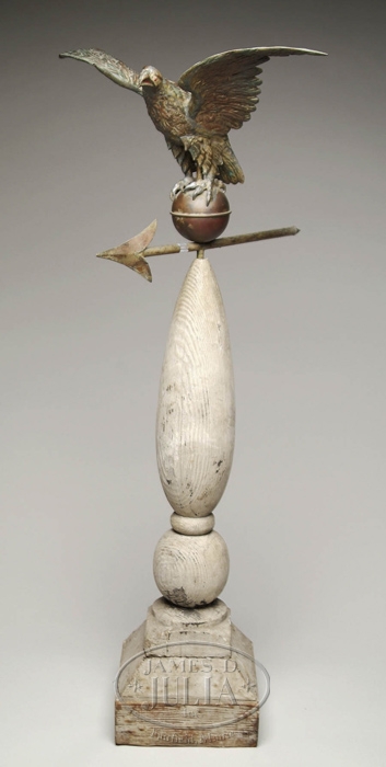 19TH OR 20TH CENTURY COPPER EAGLE WEATHERVANE. Small spread-wing eagle mounted on ball believed to be by Harris & Co. The eagle with slightly turned and tilted head and retaining some of the original gilt finish in recessed areas. SIZE: Wing span approximately 24” and approximately 17-1/2” h. from bottom of ball to top of wing. CONDITION: A couple of dents in left wing, but otherwise generally good. Nice old surface. 9-29471 (2500-3000)