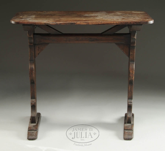 17TH CENTURY OAK RECTANGULAR TRESTLE BASE STAND. A great looking early oak stand with rectangular cut corner top on a shaped leg supports with trestle base and interesting mortised cross section just beneath the top. SIZE: Approximately 33” w x 18” d x 29” h. CONDITION: Structurally strong with minor imperfections from years of use. 9-29473 (1250-2250)