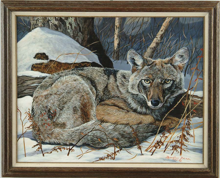 DOUGLAS BANE (American, 20th C) COYOTE. Oil on masonite shows a resting coyote nestled against a wood log on snow covered ground. Small dried plants and birch trees surround him. Nice detail. Signed lower right “Douglas Bane 1989”. Housed in a weathered molded wood frame with linen liner. Bane is a native Mainer and is known for his wildlife paintings and carvings. SIZE: 22” x 28”. CONDITION: Very good. 9-97190 (150-250)
