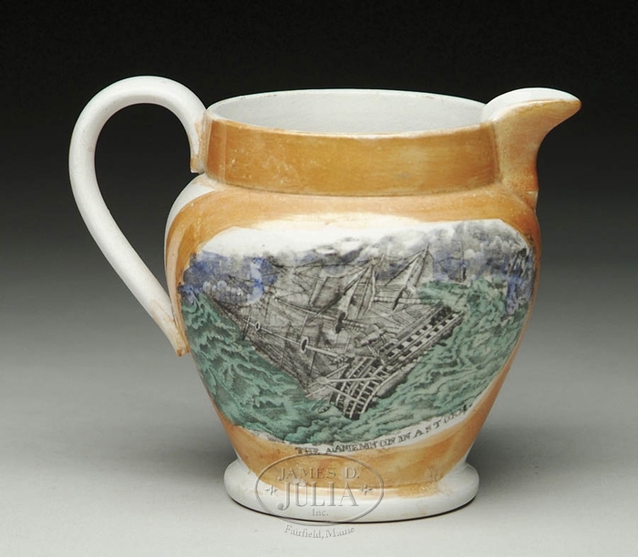 SMALL TRANSFER LUSTRE JUG. Front vignette shows a ship floundering in stormy sea and “The Amemnon in a Storm”. Other side with a sailor’s verse “The Sailor’s Toast in Stormy Sea …”. Vignettes surrounded by orange lustre. SIZE: 5” h. CONDITION: Tight hairline at rim, otherwise very good. 9-29069 (750-950)
