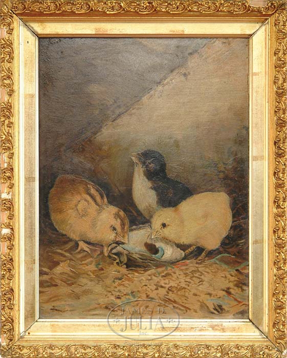 UNSIGNED (American, 19th Century) CHICKS. Oil on academy board scene shows three small chicks on straw ground. Two are yellow and one is brown and white. Housed in its original gesso decorated gilt frame. SIZE: 12” x 9-1/4”. CONDITION: Very good. 9-70028 (1,000-1,500)