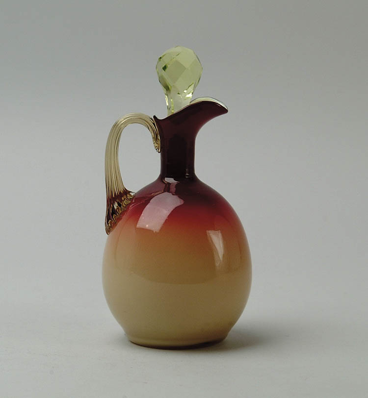 WHEELING PEACH BLOW CRUET. Bulbous form with fuschia to amber coloring, applied reeded handle and creamy white lining. SIZE: 6 3/4″ tall. CONDITION: Stopper is not original. 5-67259 (1,000-1,500)