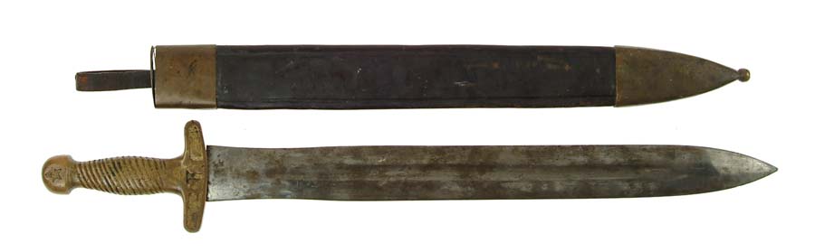 CONFEDERATE ARTILLERY SHORT SWORD. 19” single fuller blade in correct orig leather scabbard with brass mounts. This is among the most common pattern of marked Confederate short swords with “C.S.” and a star cast in hilt. This sword, however, is in as fine a condition as these can be found, with a bright blade and near perfect scabbard. CONDITION: Bright blade with about 50% orig polish & scattered areas of staining and rust. Scabbard body is covered with waxy protectorate. Rich patina to hilt and scabbard mounts. Soldered throat is nearly detached. Orig frog button has leather loop attached. 4-54491 JS42 (6,000-7,000)