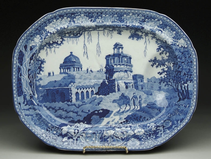 OUTSTANDING STAFFORDSHIRE BLUE & WHITE WELL AND TREE PLATTER. Impressed mark “Rogers” for Rogers & Son or J & G. Rogers. Early 19th Century. Scene shows a castle ruin with water buffalo and figures walking on dirt path. A naturalistic border with trees and flowers. SIZE: 2-1/2” h x 20-3/4” w x 16” d. CONDITION: Very good. 9-29067 (1250-1600)