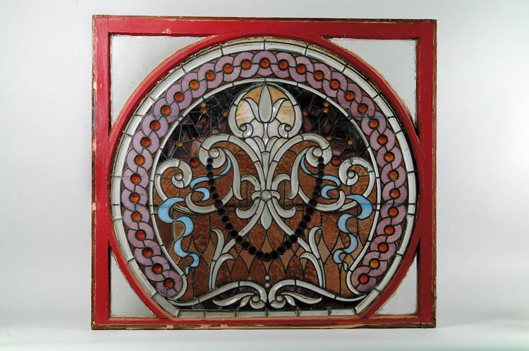 ROUND LEADED GLASS WINDOW. Beautiful leaded beveled and jeweled window has a center section of scrolled beveled glass and a chain of faceted jewels. Outside border is lavender glass braided design with faceted in the middle of each braid. SIZE: 43″ across by 39″ tall. CONDITION: Window has slight bulge at the bottom and some cracked panels, otherwise very good. 14-160-216 (500-1,000)