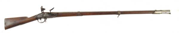 T. FRENCH U.S. MODEL 1808 CONTRACT MUSKET. Cal .69. 44-3/4” round bbl. Marked “T.FRENCH” on the lock in front of the hammer beneath an eagle holding an oval containing “US”, “CANTON” in a downward arc above 1810 on the tail of the lock. Bbl is marked with the eagle head and “CT” cartouche between the “US” and “V”. The same V is stamped on bbl tang and left side of stock above an unreadable oval cartouche. NSN. CONDITION: Gray brown patina with light pitting. Trigger guard and buttplate have a darker patina with some surface rust. Wood has numerous chips, dents and scratches and has some minor cracks at the front of the lock. There is also a fresh chip about 1/2” long above the front of the lockplate. Lock is fine and appears to be original flintlock. 4-450081 FS128 (2,000-3,000)