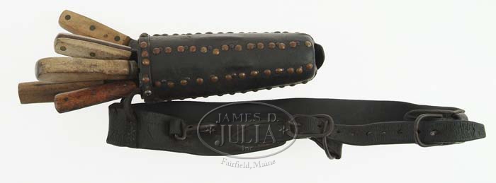 FINE EARLY BUFFALO HUNTER’S KNIFE SET. Wonderful early & unusual Buffalo hunter/skinner’s knife set & belt. Knife carrier is about 9″ high & tapers from about 2-1/5″ at the bottom to 3-3/8″ at top . Covered with leather & wood lined, leather covering is machine sewn at bottom & along side seam it has six rows of brass mixed with iron tacks with a 1/2″ strap around top, also with brass & iron tacks with carrying straps secured with modern Phillips head screws. Wood lining is very unusual in that it is cut out in a six-pointed star pattern to hold six knives. Carrying straps are sewn to a 2″ wide harness leather belt with machine sewn billets & harness buckles with a loop on one side, probably for sharpening steel. Carrier has seven knives including two J. Russell Green River skinners, a Green River butcher knife, three very early knives that show extreme hard wear & a small hunting size knife that apparently does not belong with this set. CONDITION: Leather is well oiled & supple, although belt is very crackled & a little fragile. Knife holder is dark & stained but mostly intact. Two carrying straps are modern replacements. The three Green River knives are fine with other three knives very worn & used. Small knife is fine. 4-57676 JR529 (2,000-3,000)
