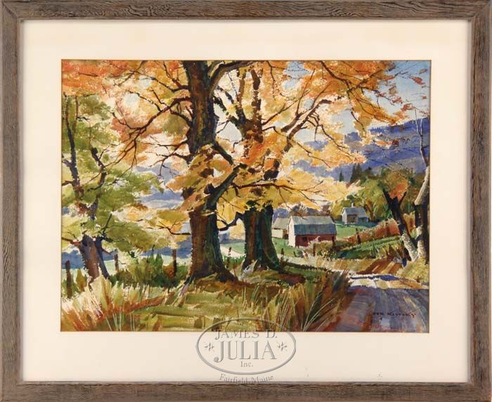 TED KAUTZKY (American, 1896-1953) AUTUMN IN NEW ENGLAND. Fine watercolor fall scene shows a road on edge of hillside with colorful maple trees and New England farm. Signed lower right. Housed in a period wood frame with white matte. A fine example of the Rockport, Massachusetts artist. SIGHT SIZE: 21-1/2” x 29”. CONDITION: Very good. 9-74702 SM (2,000-3,000)