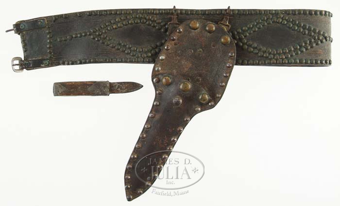 19TH CENTURY BRASS TACK DECORATED BELT. Large antique belt approx. 3-3/4″ wide with simple tooled lines and nicely ornamented with series of period brass studs or tacks. Attached is a period leather scabbard also ornamented with old brass studs. A small handmade knife with 2″ blade and wood and pewter handle is in the sheath. SIZE: Lenth of belt: 41″. CONDITION: Partial separation of belt at clasp. A few tacks missing. Shows wear and abrasion and is stiff. 4-57701 (1,000-2,000)