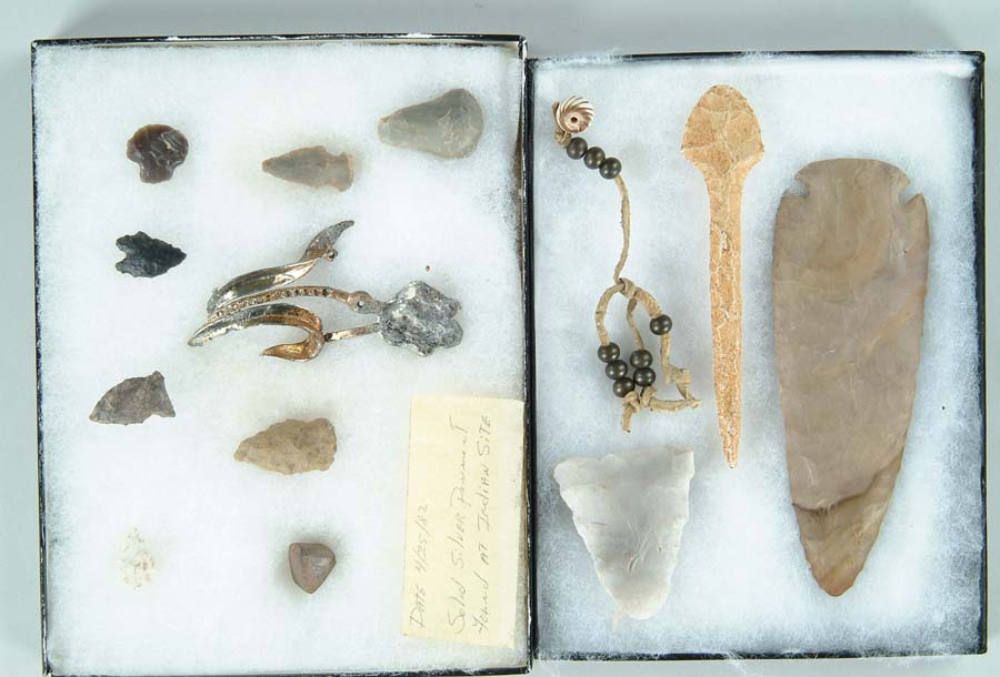 SEVEN CASES OF INDIAN ARTIFACTS. 1) Small fluted point labeled Cumberland River, Bell County. 2) Two possible Paleo tools. 3) 5” stone drill. 4) 22 Western style gem points. 5) Glass trade beads, dovetail and triangular knife. 6) Shell beads, banded slate gorget, glass trade beads, corner notch projectile point of Knox chert. 7) Small arrowheads and metal object labeled “Solid Silver Pendant found at Indian Site”. CONDITION: Fair to very good. 9-25984-185 The Tennessee Collection of Prehistoric Indian Artifacts from the Allen Graves Estate. SPECIAL NOTE: We do not regularly sell Prehistoric Indian stone artifacts and therefore have very little experience and no expertise in this area. All of the following lots have come from the Collection of the Late Allen Graves of Tennessee. The collection was inherited some years back by his daughter, who now lives in Maine. This collection was consigned to us directly from her. We employed someone to generally identify styles and types, but as stated above, due to our lack of expertise in this field, we can not guarantee the age or origin of the following pieces. We are relying on you, the buyer, to determine to your satisfaction the origin and age of each item in the collection. (250-300)