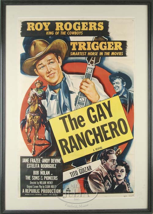 LOT OF THREE OLD COWBOY MOVIE POSTERS. One for Hoot Gibson, “Outlaw Trails”, another Hoot Gibson “Utah Kid” and the third a (pre-“Brokeback Mountain”) movie poster of Roy Rogers in “The Gay Ranchero”. All three images are colorful and are pretty much the same size. The Roy Rogers image is framed whereas the two Hoot Gibson’s are on Styrofoam background. SIZE: approx 26”wide x 40”high (image) each. CONTIION: Generally good. They each show creases and folds. The Hoot Gibson’s have some damage and discoloration but generally good. 4-57646 (1,000-2,000)