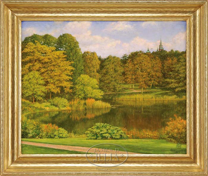 JOHAN WALDEMAR DE REHLING QUISTGAARD (American/Denmark, 1877-1962) THE PARK POND. Oil on masonite summer park scene shows a small pond with grass banks set amongst large trees above which are three steeples. Signed lower right “Quistgaard 1958″ with an accompanying seal. Housed in a fine gilt modern frame. SIZE: 20″ x 24-1/2”. CONDITION: Very good with some inpainting. 9-94202 (1,000-2,000)