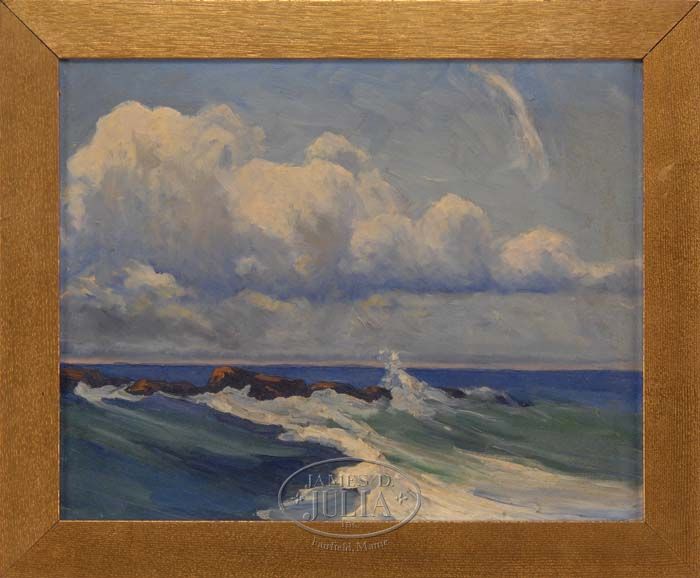 CHARLES HERBERT WOODBURY (American, 1864-1940) THE COAST OF OGUNQUIT. Unsigned oil on canvas coastline scene shows waves crashing onto rock outcropping with blue ocean beyond under puffy white clouds and blue sky. Housed in a flat gilt wood frame. SIZE: 16” x 20”. CONDITION: Very good. 9-74597 MD (3,000-4,000)