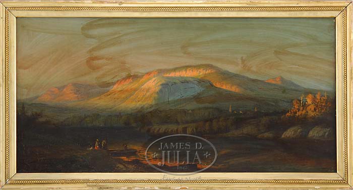 JOHN CHRISTOPHER MILES (American, 1837-1911) “MEGUNTICOOK MTS, CAMDEN, MAINE”. Large oil on canvas panoramic view of Megunticook Lake at the base of the small Megunticook mountain range. Two people are being ferried across the lake to the small town at the base of the mountain. Unsigned front but having its original label on reverse with title and artist signature. Housed in its original gilt and gesso decorated liner. An extremely rare view by this listed artist. SIZE: 20″ x 40″. PROVENANCE: The Estate of Chad Richards, Camden, Maine. CONDITION: Appears to be backed on aluminum, discolored varnish, restored area in center mountain, in need of cleaning. 9-94688 (5,000-10,000)