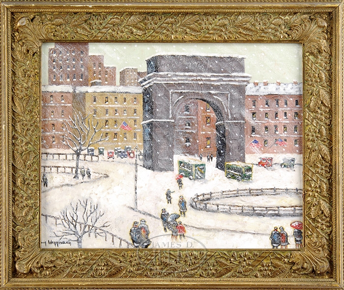 GUY CARLETON WIGGINS (American, 1883-1962) “WASHINGTON SQUARE”. Oil on canvas scene shows Washington Square in New York City during a snow storm. The ground is snow covered with snow falling. A number of pedestrians are seen along with cars and buses. An archway entrance is seen against multi-story buildings. Three American flags flying off buildings. Signed lower left “Guy Wiggins N.A.”. Housed in an antique gesso decorated frame with fancy flower decorated liner. Title and artist signature on reverse. Also a Louis Katz Art Galleries stamp affixed to stretcher. SIZE: 18″ x 24″. CONDITION: Very good. 9-92838 (40,000-60,000)