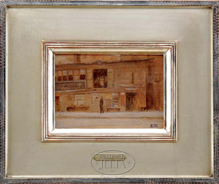 ERNEST HASKELL (American, 1876-1925) WAREHOUSE ROW. Oil on wood panel shows the side of an industrial warehouse with a man walking right to left in front. Signed lower right “E H”. Housed in a fine gilt carved wood reproduction frame with gilt artist plaque. SIZE: 4-1/2″ x 6-3/4″. CONDITION: Very good. 9-95489 (600-800)