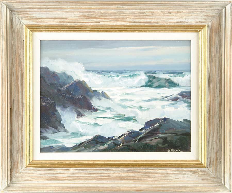 PAUL STRISIK (American, 1918-1998) BASS ROCKS. Oil on board scene shows crashing waves on coastal rocks, white spray, green ocean, blackish/blue rocks. Housed in it’s original painted molded wood frame with gold inner frame and white liner. Signed lower right “Strisik”. Artist stamp to reverse and dated “August 1, 1961”. SIZE: 12” x 16”. CONDITION: Very good. 9-98000 (1,200-1,500)
