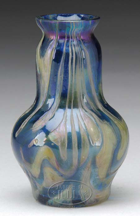 LOETZ DECORATED VASE Rare bottle glass blue background vase is decorated with a platinum, purple and green pulled decoration overall. Unsigned. SIZE: 5-1/2″ t. CONDITION: Very good with polished rim. 5-65076 (350-550)