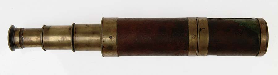 MID 19TH CENTURY NAVAL BRASS AND LLEATHER TELESCOPE. A large barreled and finely made brass telescope complete with sunshade that measures 34” fully extended, and 10” closed. The brass bbls descend in diameter, the largest being 2.25”. The telescope in completely unmarked but very well made, most likely English or, possibly American and dates to the period 1840-70. The exterior of the body and sun shade bbls are covered in brown leather. Very powerful optics. CONDITION: Good. Telescope extends and closes easily, a medium age patina is present overall. Leather covering is separated at the seams and there is an approximate 5-10% loss. 4-54462 CoW12 (250-350)