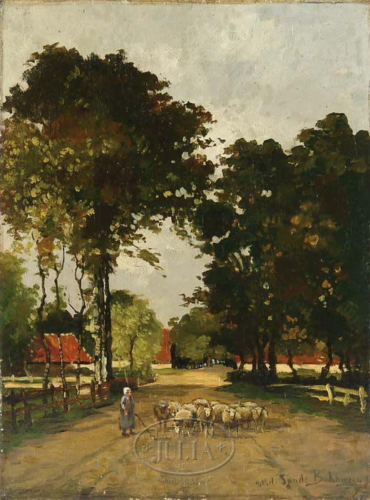 ATTRIBUTED TO HENDRIK VAN DE SANDE BAKHUYZEN (Dutch, 1795-1860)) THE LITTLE SHEPPARD”. Oil on wood panel scene shows a young girl tending her small flock of sheep on a dirt road with fence and trees lining each side. Several buildings with red roofs are seen in background. Signed lower right. Unframed. SIZE: 15-3/4” x 11-1/2”. CONDITION: Very good, inpainting. 9-70186 (1,500-2,500)