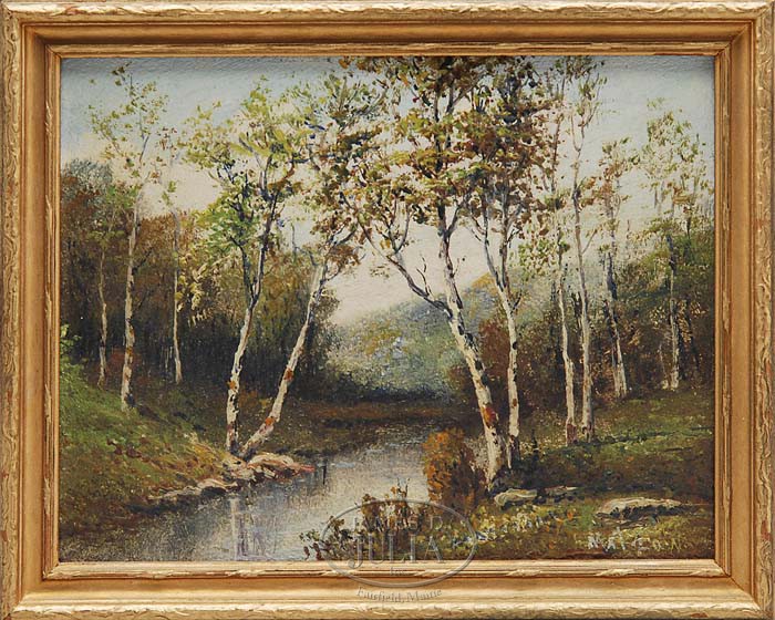 MATZOW PAINTING. Wonderful oil painting on board is done by famed Handel lamp artist Fred Matzow. The lovely painting depicts aspen trees alongside a stream with mountains in the background. Signed in lower right hand corner “Matzow”. The painting is housed in a simple gold and gesso frame with gold finish. From the collection of Dr. Irving Paul. SIZE: Painting 7″ x 9″. Overall 8″ x 10″. CONDITION: Very good to excellent, with some minor wear to finish on frame. 5-66743 (200-400)