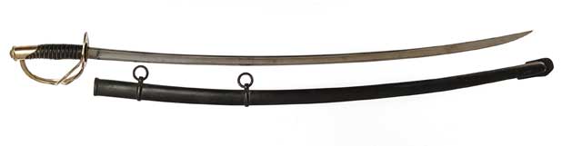 ROBY MODEL 1860 CAVALRY SWORD. 34-7/8” dbl fuller blade marked “C. ROBY / W. CHELMSFORD / MASS” on the left ricasso and “U.S. / 1865 / A.G. M” on the right. Leather covered grip with twisted brass wire. Iron scabbard with iron mounts. CONDITION: Right blade with light rust stains and a few nicks on the edge. Minor scuffs through the leather on the grip, otherwise the hilt is fine. Minor scratches and dents on the scabbard with some light rust. 4-48608 FS155 (Lowry Estate) (650-1,000)